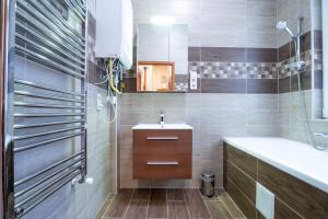 There are two bedrooms and a bathroom with a bathtub and shower. The bathroom has free toiletries and hair conditioner. The apartment is soundproof, non-smoking, and allergen-free. It includes a flat-screen TV with satellite channels, washing machine, clothes dryer, and iron.