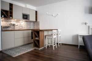 The apartment includes one bedroom with a wardrobe or closet, a living room with a flat-screen TV and satellite channels, and a kitchen equipped with an oven, microwave, and stovetop. The bathroom has either a bathtub or shower, free toiletries, and a hairdryer. Towels and bed linen are provided.