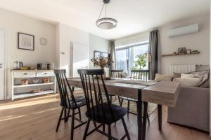 The apartment includes two bedrooms, a living room with a sofa bed, and a balcony with views of the city and landmarks. The kitchen has a dishwasher, oven, toaster, and refrigerator. The bathroom has a walk-in shower and hairdryer. Towels and bed linen are provided.