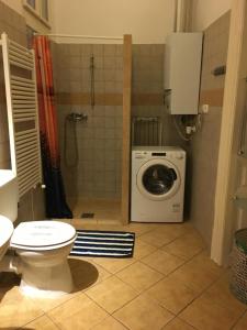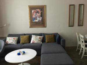 The apartment has two bedrooms, a kitchen with a dishwasher and oven, a living room with a sofa, and two bathrooms with walk-in showers. There is a flat-screen TV in the room as well as a dining area. An additional toilet and an electric kettle are provided. Floors are finished with wood or parquet.