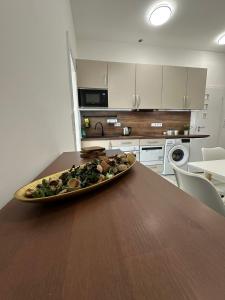 The apartment includes one bedroom, a bathroom with a shower, and a fully equipped kitchen with an oven and dishwasher. The room has a flat-screen TV with streaming services. Guests have access to a washing machine as well as towels and bed linen.