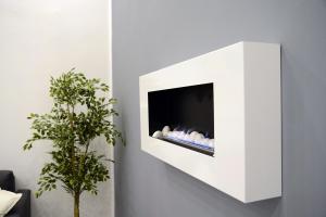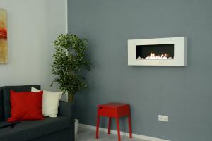 The apartment has one bedroom and a living room with a flat-screen TV with satellite channels. It includes a fully equipped kitchen with an oven and microwave, as well as a bathroom with a walk-in shower. The rooms are soundproofed, floors have parquet, and there is a fireplace in the living room.