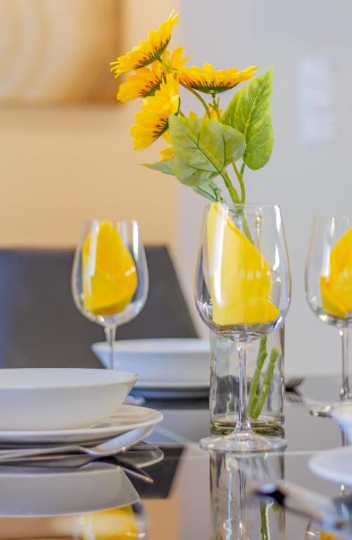 The apartment has one bedroom, a living room with a flat-screen TV, and a kitchen equipped with a dishwasher, oven, and coffee machine. There is a bathroom with a bidet and hairdryer. Linen and towels are provided along with individually controlled air conditioning and heating.