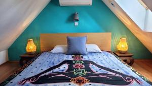 The property includes a shared kitchen next to the lounge, as well as a terrace and garden with a hammock.