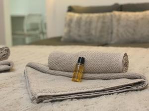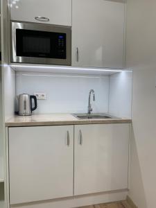 The air-conditioned apartment has a separate bedroom and a fully equipped kitchenette with a microwave and refrigerator. The bathroom includes towels and bed linen. The accommodation is allergen-free and for adults only.