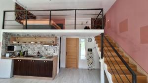 The apartments have wooden floors and a kitchenette with a microwave, toaster, refrigerator, stovetop, coffee machine, and electric kettle. The seating area includes a flat-screen TV with cable channels and streaming services. Private bathrooms have a shower and hairdryer.
