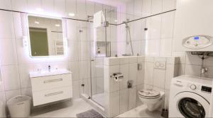 The apartment includes two bedrooms, a living room with a flat-screen satellite TV, and a kitchen equipped with a dishwasher, microwave, toaster, and coffee maker. There are two bathrooms with showers and a washing machine. Towels and bedding with non-feather pillows are provided.